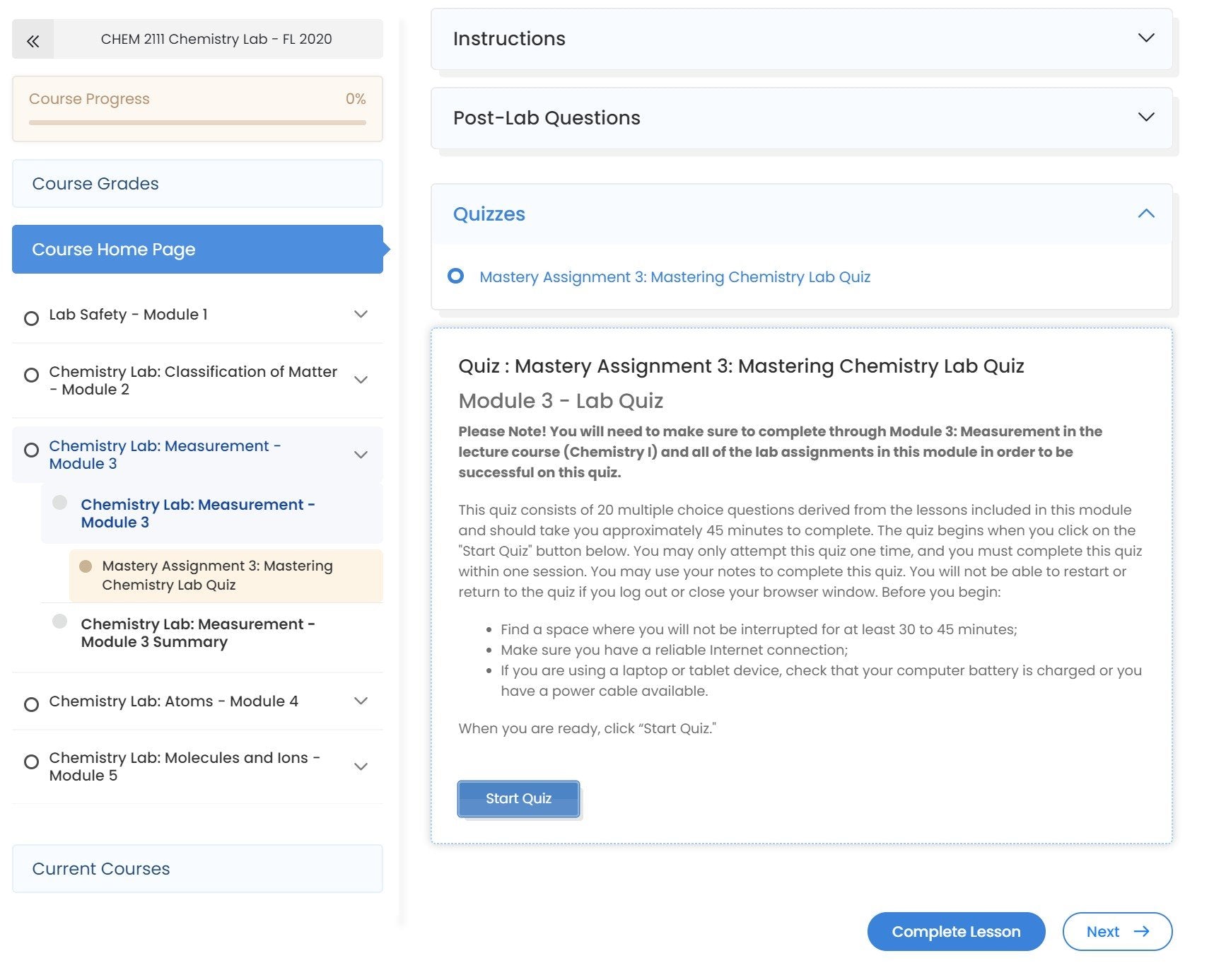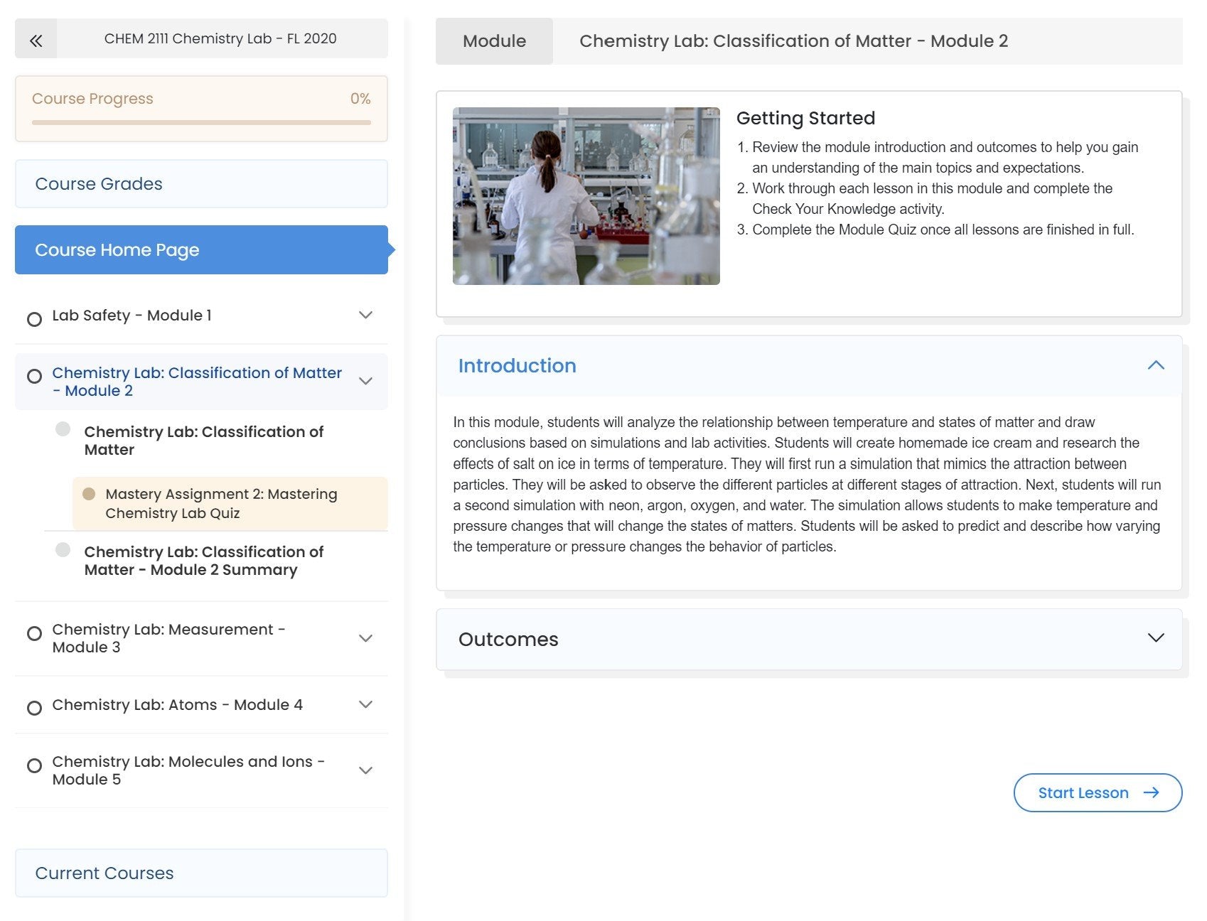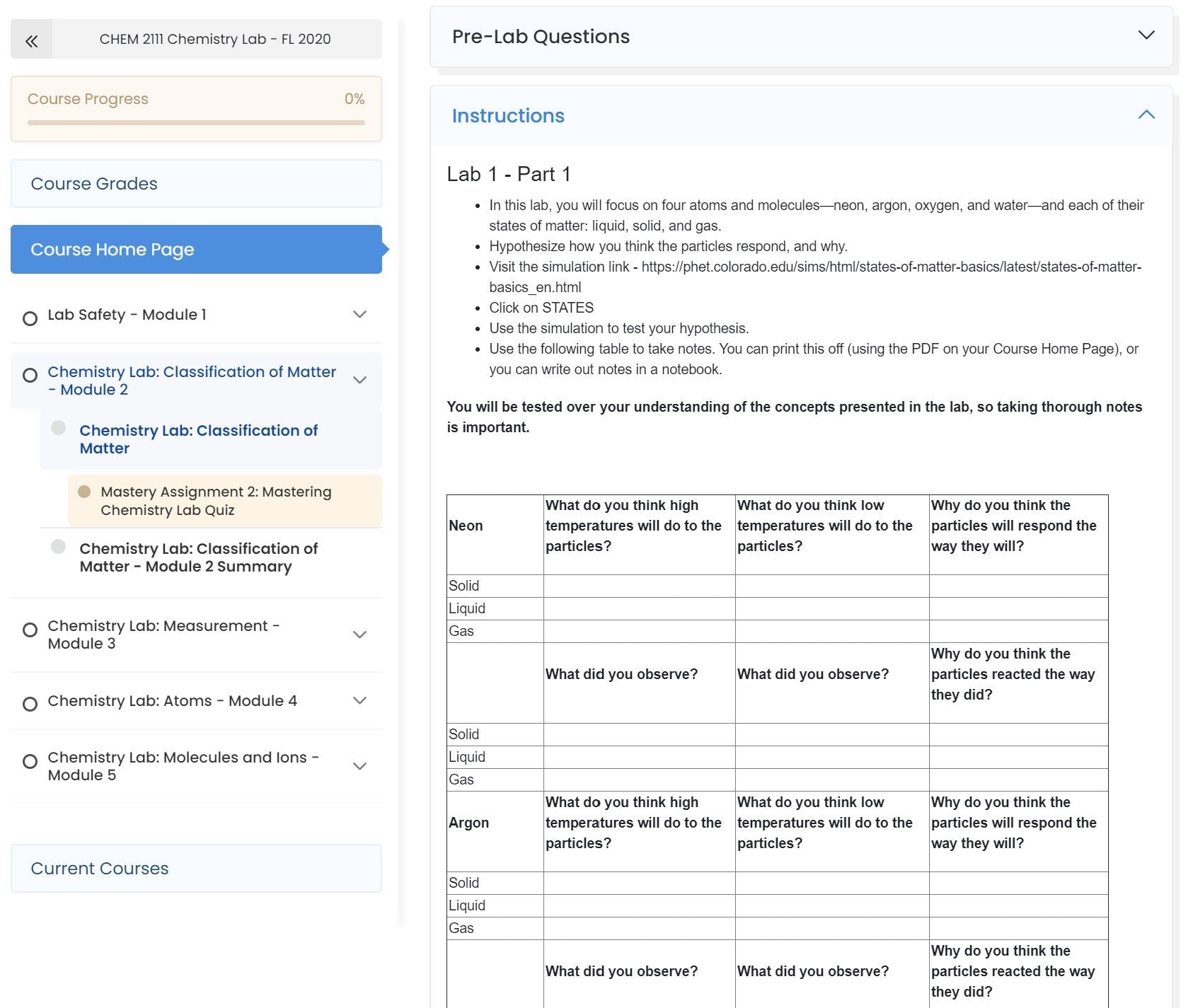 This course also provides a comprehensive introduction to the laboratory study of chemistry. In this course, students will learn about lab safety and explore topics like the metric system and the scientific method. Students will apply foundational concepts such as the classification of matter, atoms, molecules and ions, the structure of atoms, chemical equations, and solutions, among others, to hands-on home lab and simulation activities.