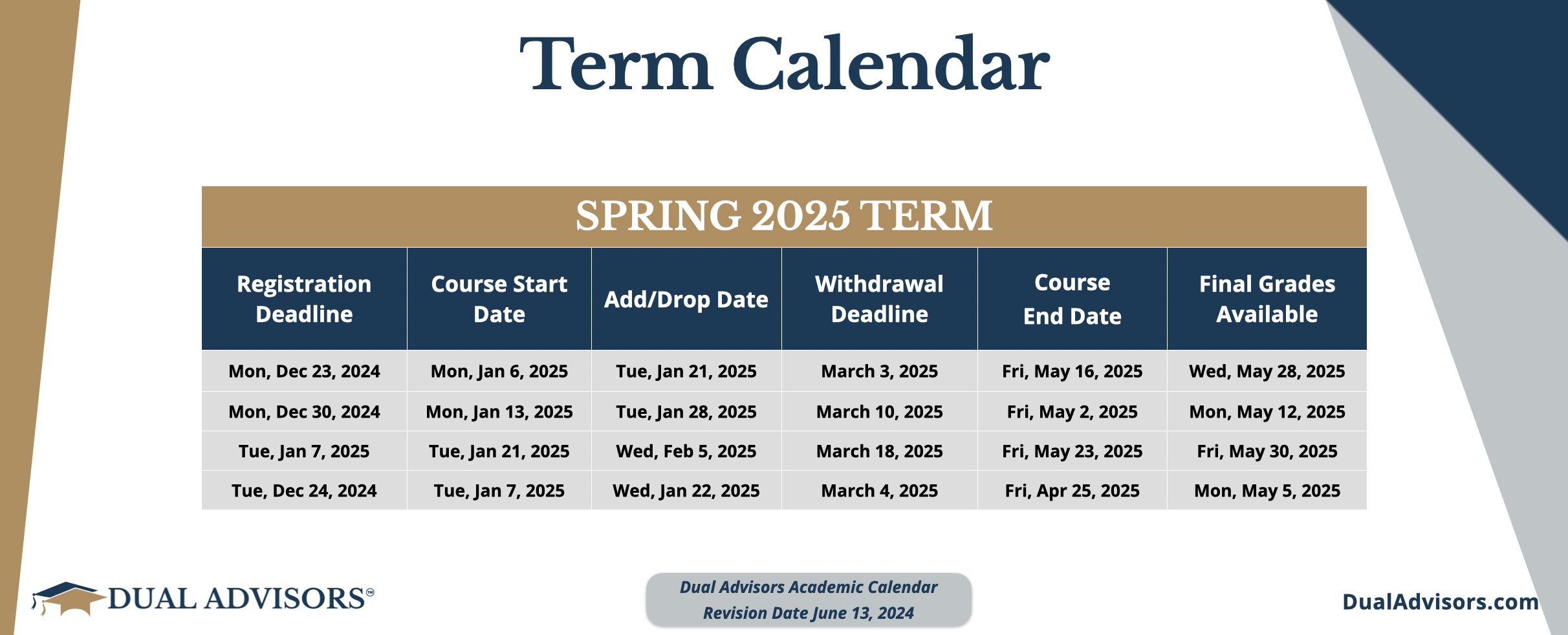 For more detailed information about Dual Advisors' refund and drop date policies, see our Refund & Drop Date Policies Page.