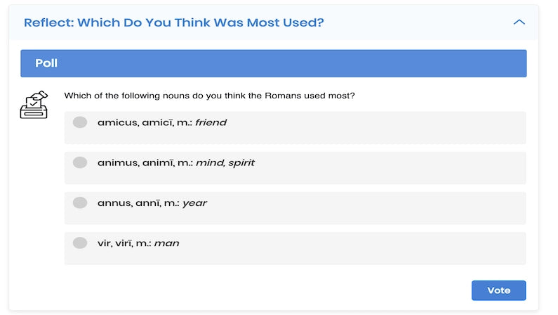 This course introduces students to the basics of Latin grammar, syntax, and vocabulary. Students will be introduced to the six indicative active tenses of first, second, third, third ‐io, and fourth conjugations, as well as those same tenses of the irregular verbs sum and possum. Students will meet the present, imperfect, and future indicative passive tenses of first and second conjugations. The present infinitives, active and passive, will also be presented. Students will also learn about first, second, and third declension nouns; first, second, and third declension adjectives; special ‐ius adjectives; the reflexive adjective; interrogative adjectives; demonstratives; and numbers. Personal pronouns, reflexive pronouns, relative pronouns, and interrogative pronouns will also be taught.