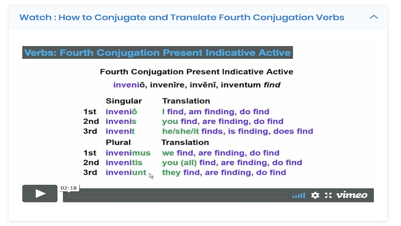 - Reconstruct all active indicative regular verb endings and translations in their respective tenses (present, imperfect, future, perfect, pluperfect, and future perfect).