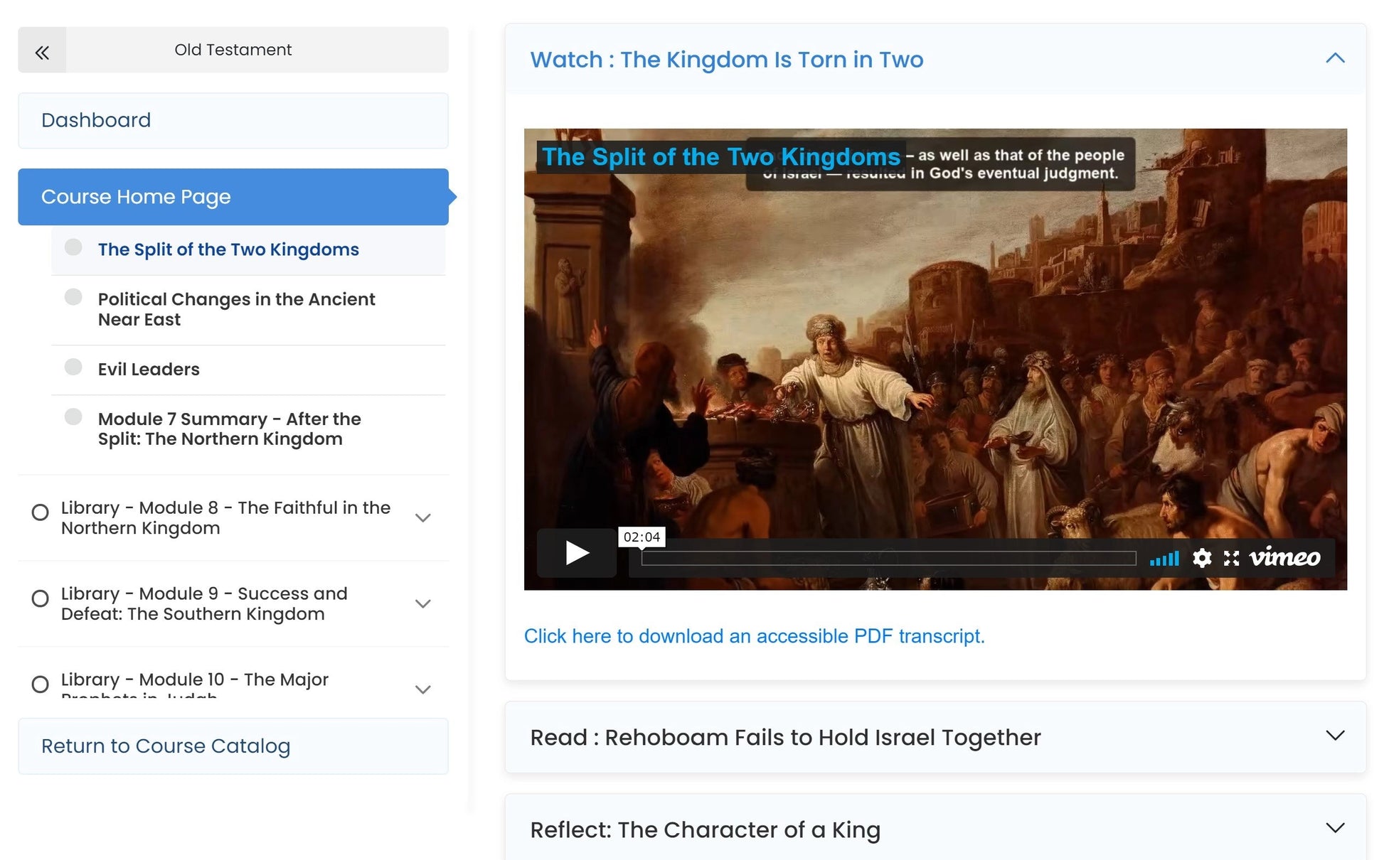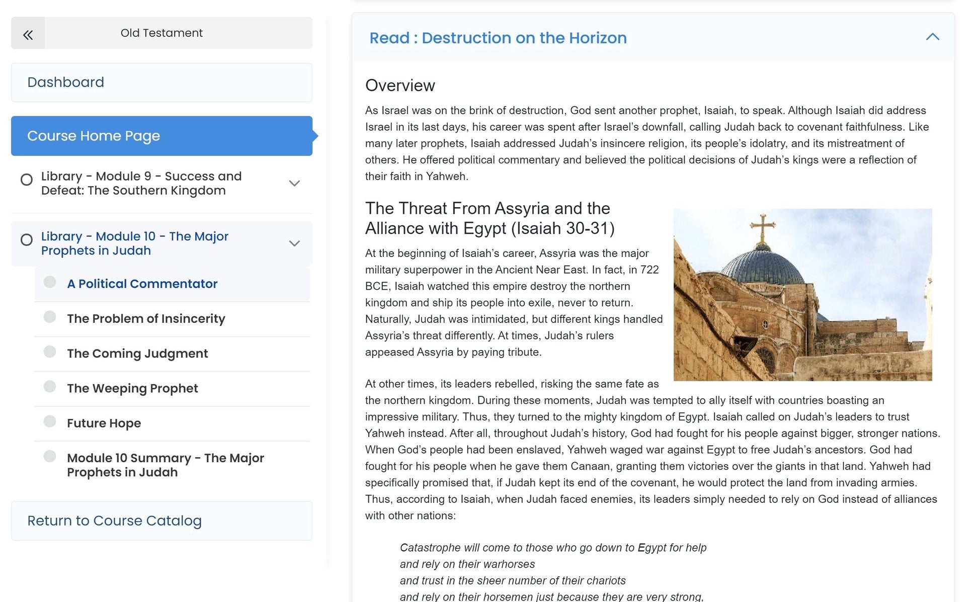 The Old Testament course examines the character of Yahweh God as displayed throughout the history of Israel, and compares and contrasts it with human character qualities. In an ancient world full of angry, spiteful, and deceitful gods, what kind of god is Yahweh? Is he also vindictive and impatient? Is he compassionate and gracious? In order to ascertain the character qualities which most define God, students will observe his actions toward the Jewish people throughout their history; in particular, students will study God’s behavior toward the earliest ancestors of the Israelites, toward the enslaved Hebrews in Egypt, toward the judges who led the Israelites, toward the kings who ruled Israel and Judah, and toward the Jews who heard the preaching of the pre- and post-exilic prophets. Students will also witness the character qualities of many humans on display, some of whom reflect God’s good character qualities as they are called to do, but many who demonstrate less honorable character qualities. The behaviors, hopes, and prayers of these individuals will be examined. This course ultimately seeks to introduce students to the God of the Old Testament.