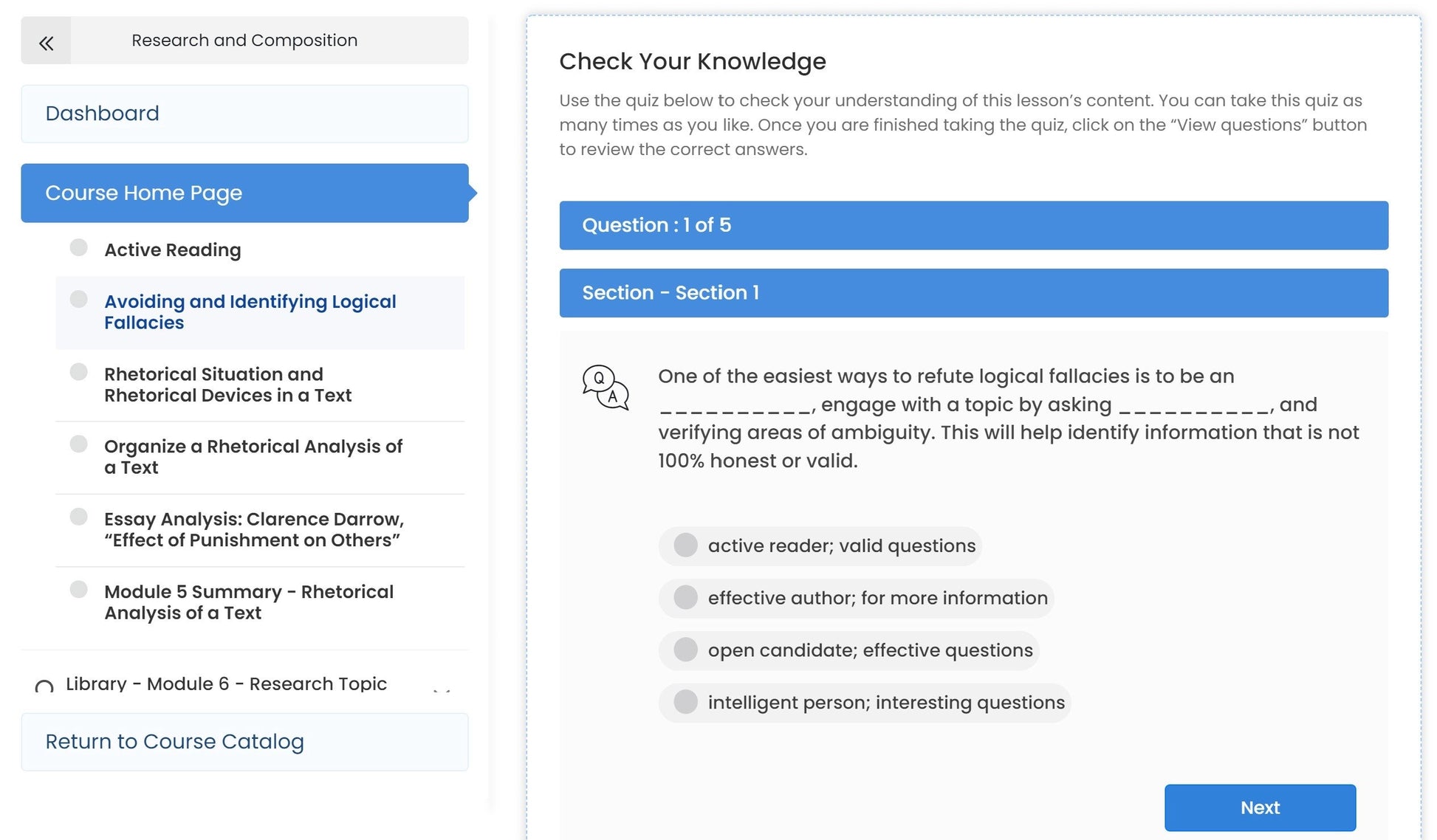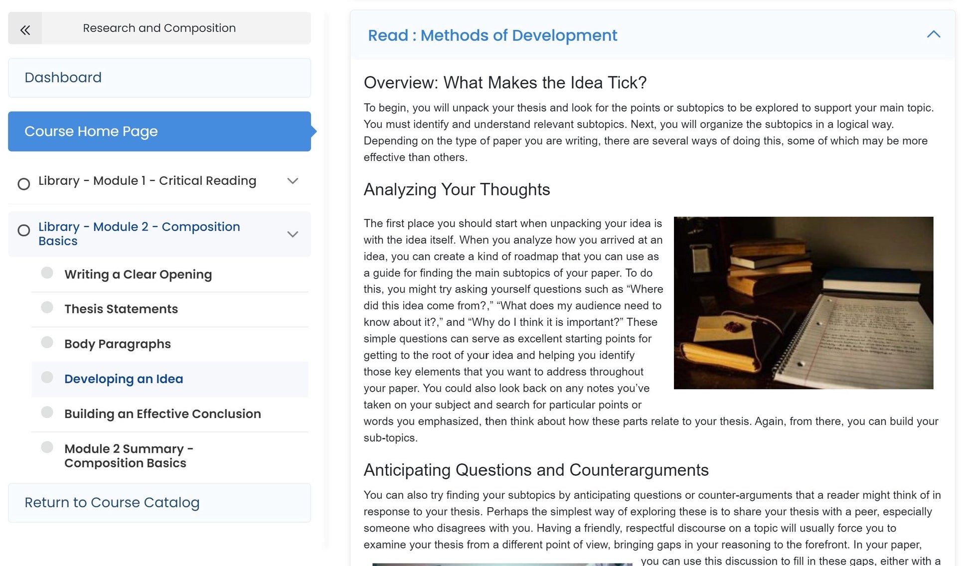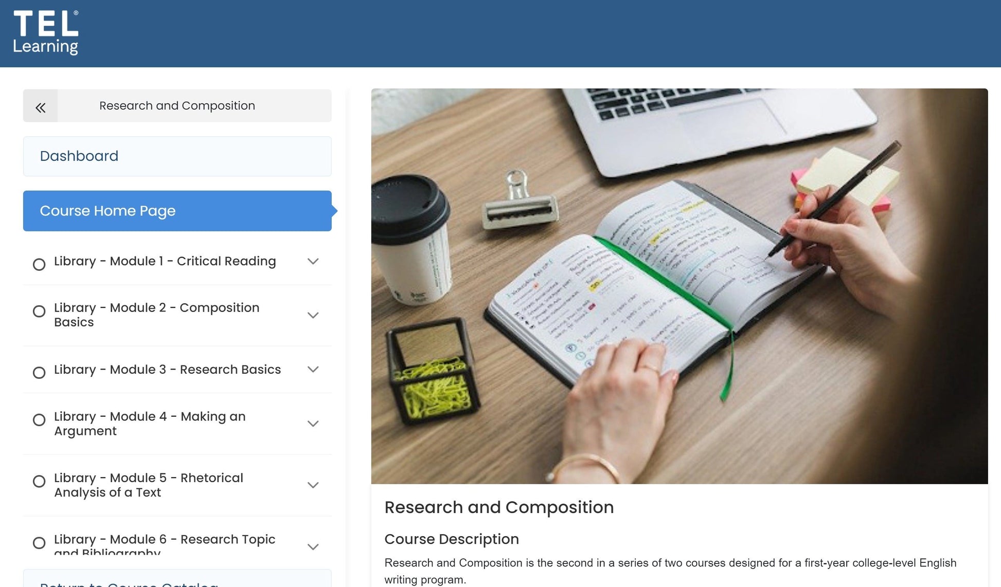 Research and Composition is the second in a series of two courses designed for a first-year college-level English writing program. Its purpose is to further develop students’ abilities to read and think critically by analyzing texts and evaluating sources, to research and evaluate evidence competently, to develop logical reasoning and persuasive argument skills, and to communicate ideas in appropriate written media and styles. It introduces students to academic writing, basic research, and the art of argumentation, as well as reinforcing concepts introduced in previous composition courses.